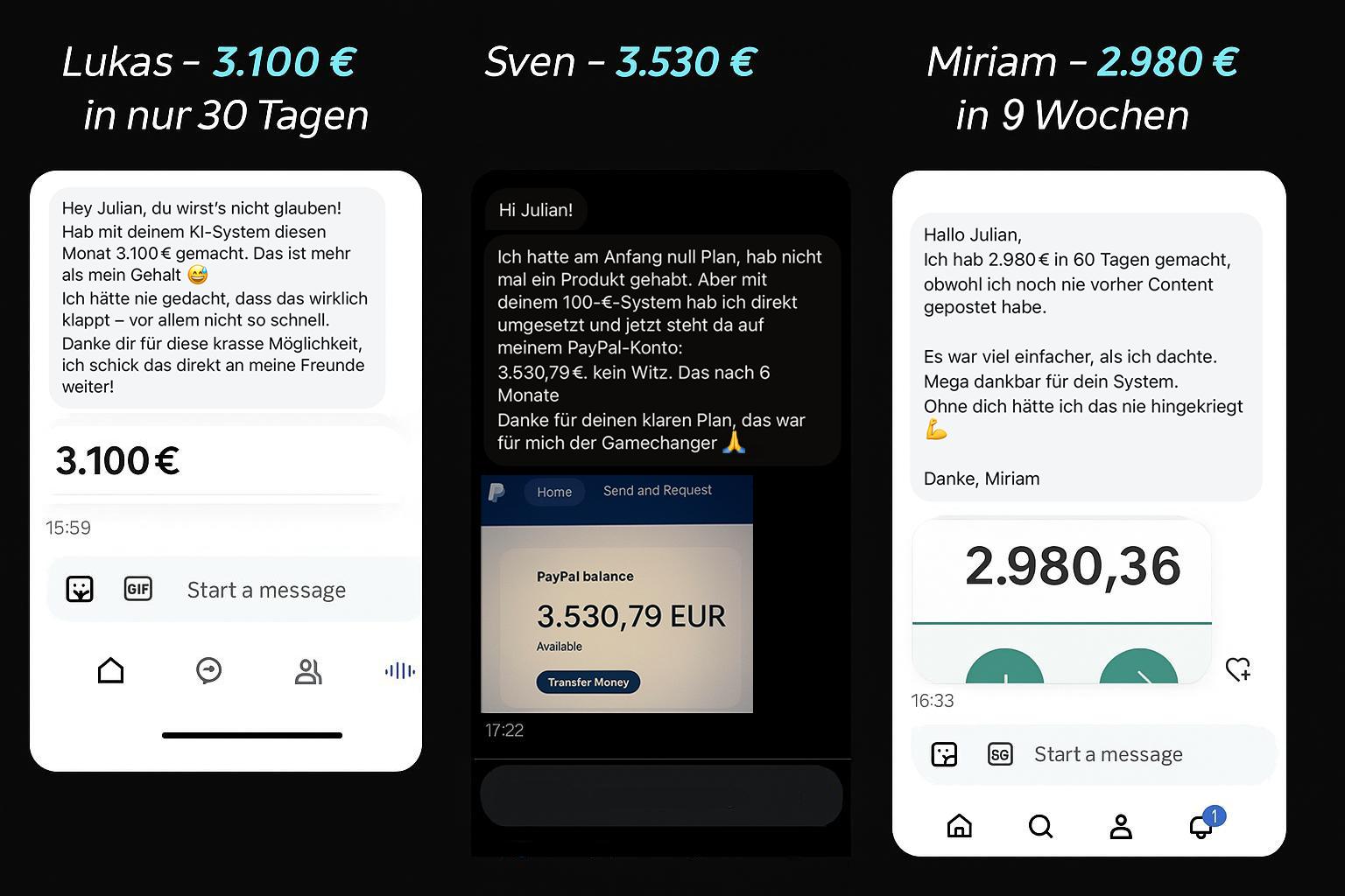 Ich war skeptisch. Wieder so ein Online-Versprechen? Aber ich habe’s durchgezogen und wurde belohnt. Die ersten 100 Euro kamen schneller, als ich gedacht hätte. Danke Julian!